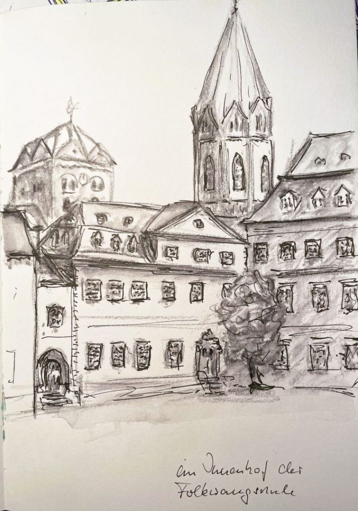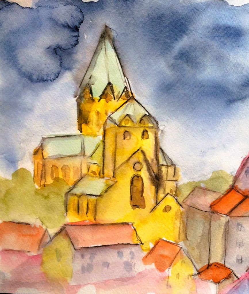 Die Kirche St.Ludgerus ist immer wieder ein besonderes Motiv für mich. Die Abteikirche, oder auch nach dem Gründer der Abtei Werden „St.Ludgerus“ genannt, prägt das Stadtbild des Ortes. Kein Wunder, dass ich die Basilika schon aus allen möglichen Blickwinkeln skizziert habe. Und so manche Skizze hat dann als Vorlage für ein Aquarell oder Acryl-Gemälde in meinem Atelier gedient. So auch das Aquarell auf dem Kalenderblatt Dezember 2025.