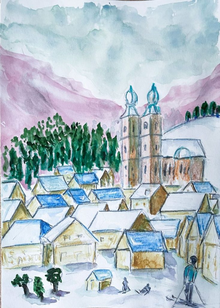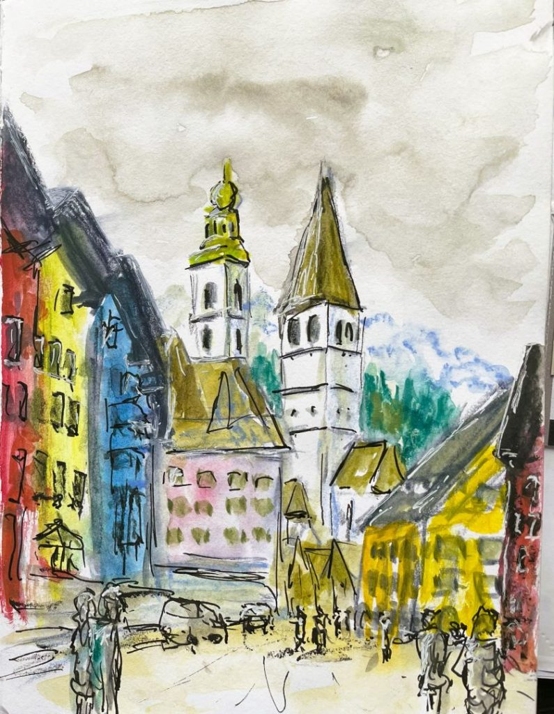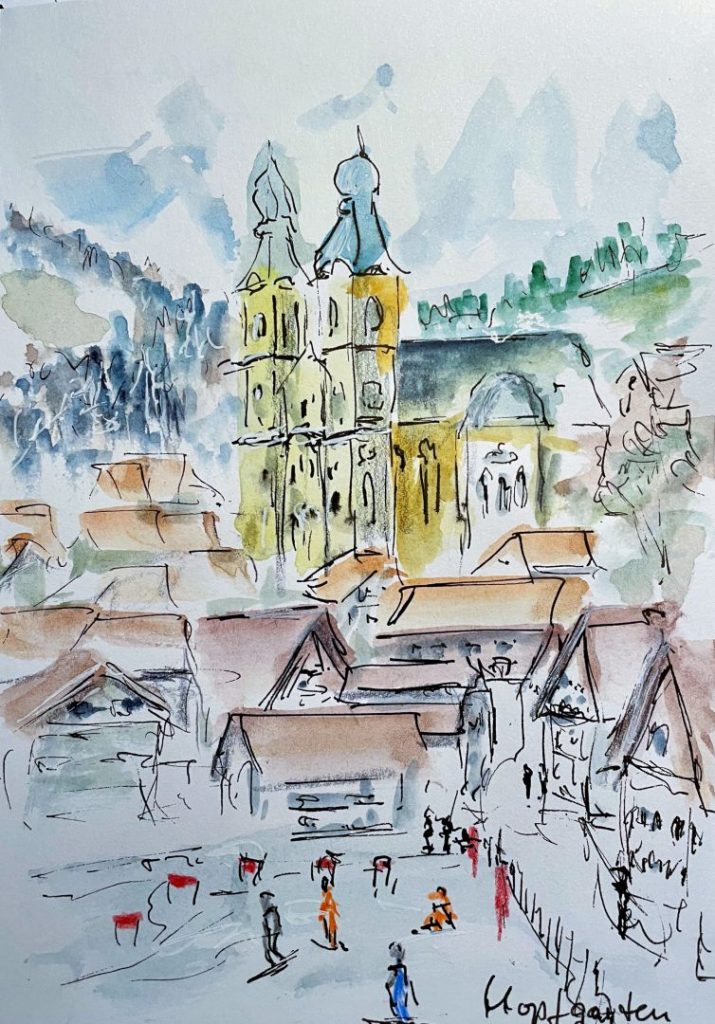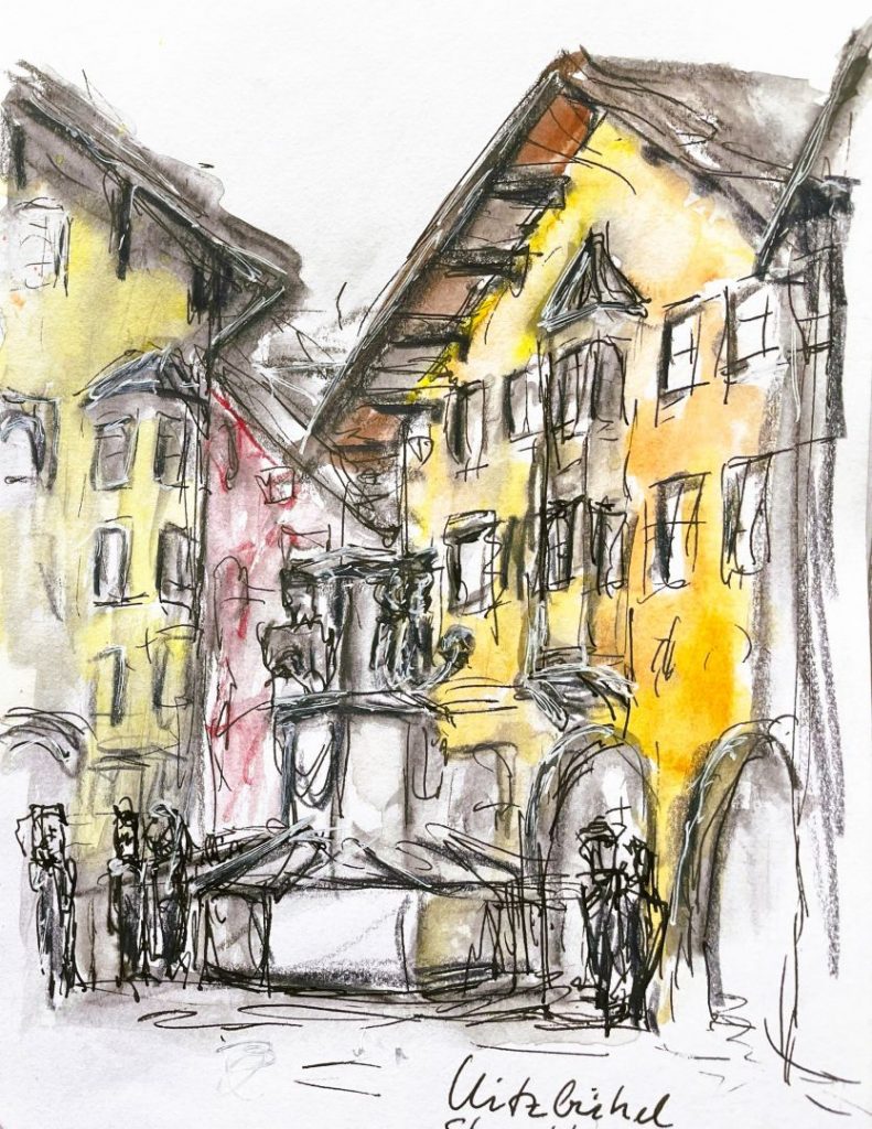 Im letzten Jahr waren wir zum Ski-Laufen in Hopfgarten, im Skigebiet „Wilder Kaiser“. Wenn man bei der Talabfahrt aus dem Wald kommt und nur noch den letzten Hang zur Talstation zu bewältigen hat ergibt sich ein grandioser Blick auf Hopfgarten. Diesen Blick habe ich in der Skizze festgehalten. Allerdings habe ich nicht auf der Piste gezeichnet, sondern später in Hotel mit dem Foto als Erinnerungsstütze. Zu Hause habe ich dann die Szene nochmal als Aquarell umgesetzt. Irgendwie finde ich die schnellen Skizzen lebhafter.