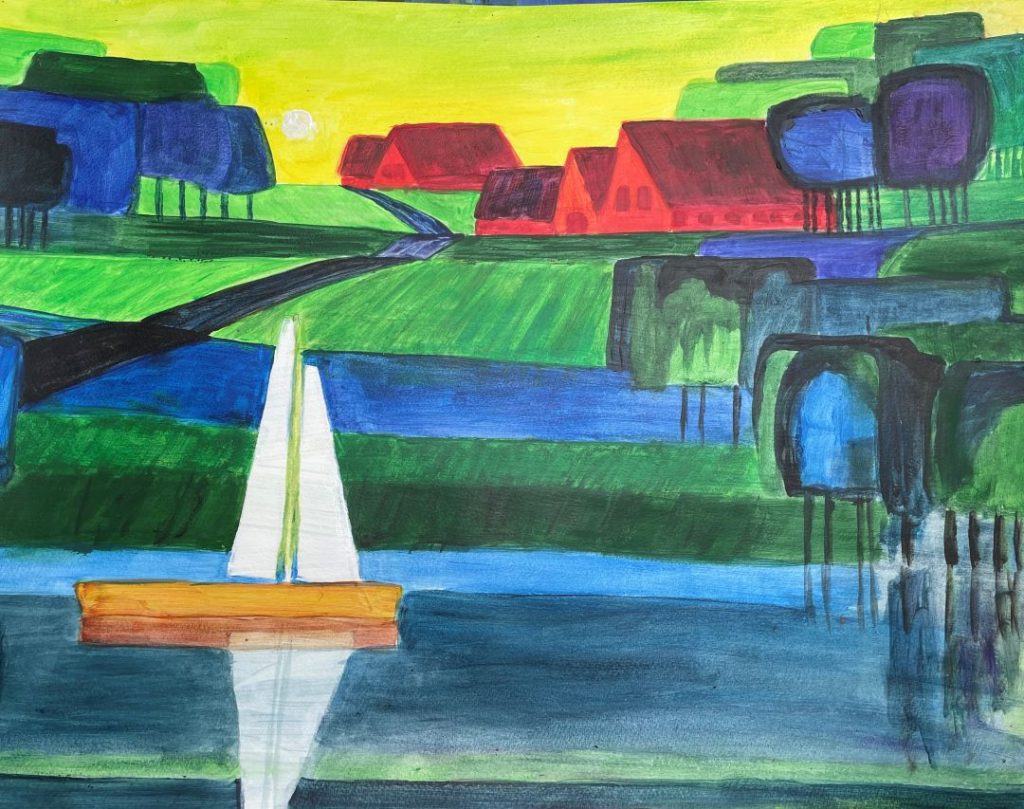 Ton Schultens Malerei fasziniert mich. Die leuchtenden Farben und die reduzierten, fast geometrischen Flächen in seinen Bildern betonen die Schönheit der Landschaft und die Magie des Lichtes. So habe ich einige Lieblingsbilder von Ton Schulten kopiert, bevor ich „meine“ Landschaften in der Malweise von Ton Schulten gesehen habe.