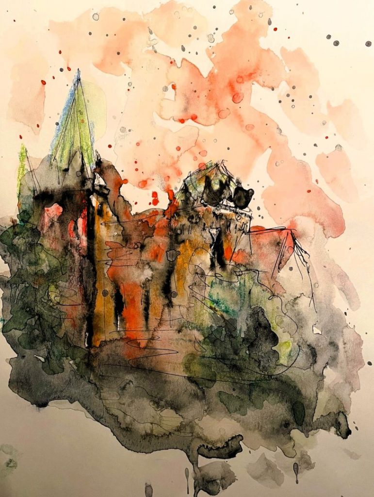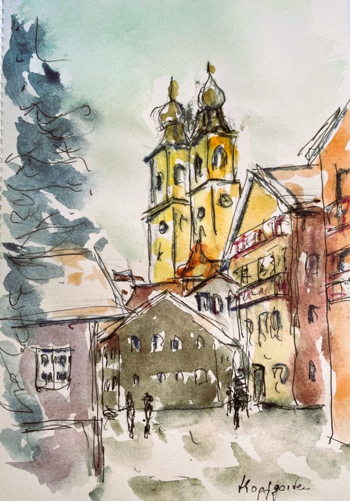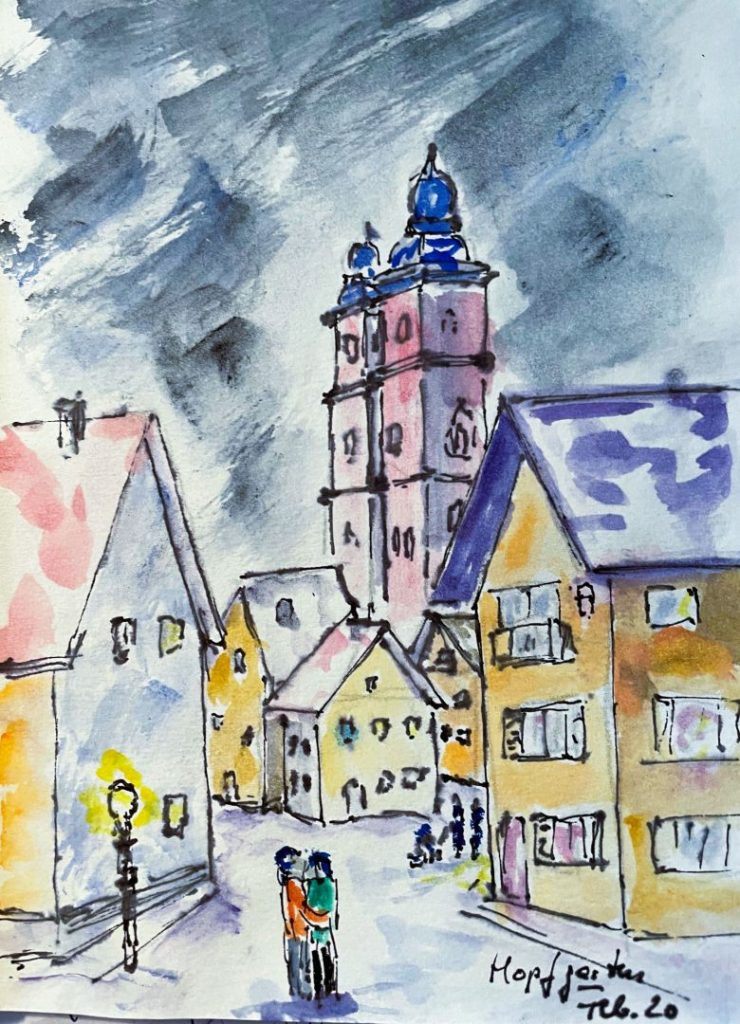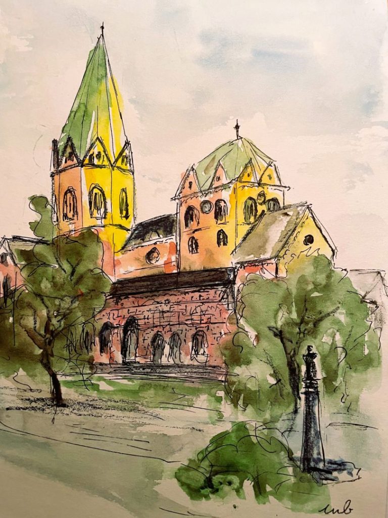Oftmals inspirieren mich die Skizzen aus meinen Tagebüchern auch zu einem Bild im heimischen Studio und manchmal finde ich den Mut zu einer ganz freien Umsetzung. Das „stürmische“ Aquarell von St.Ludgerus hat mir letztlich gefallen und so den Weg in den Kalender geschafft.