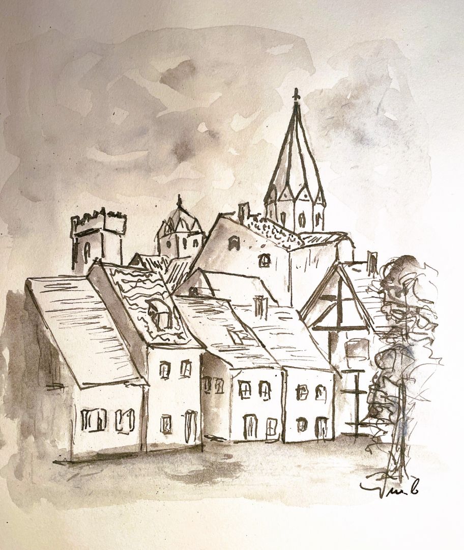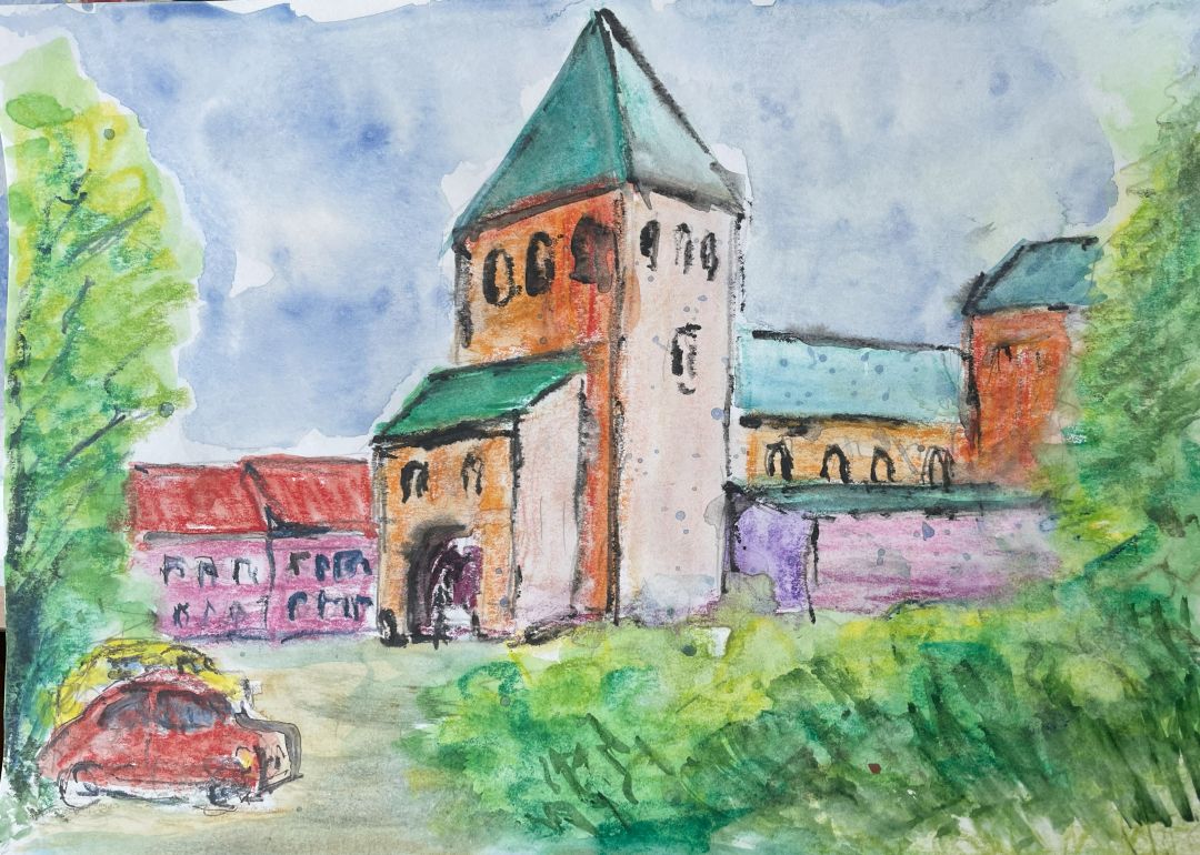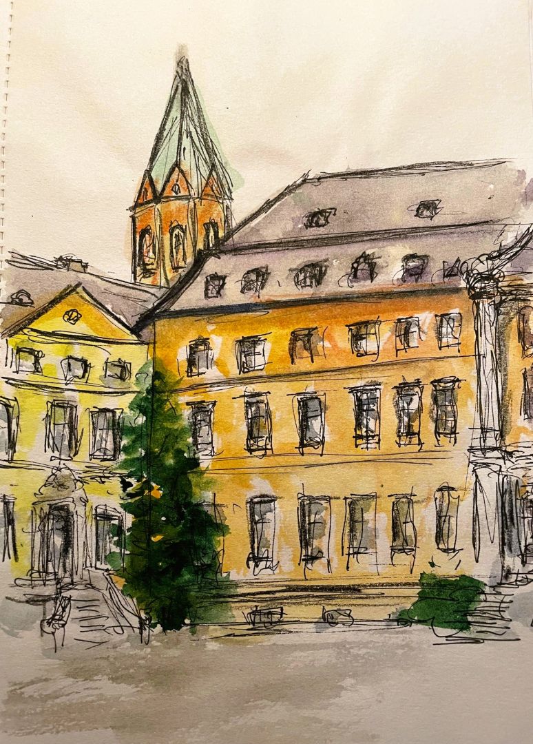 Bei einem Spaziergang durch die Werdener Altstadt lohnt auch immer ein kleiner Abstecher in den Campus der Folkwang-Schule. In der Universität der Künste hört man beim Rundgang aus den Fenstern Musik der unterschiedlichsten Instrumente. Diese Atmosphäre wird noch unterstützt durch das barocke Gebäude der ehemaligen Benediktiner Abtei. Ein Ort der einfach nach einer Skizzenpause ruft.