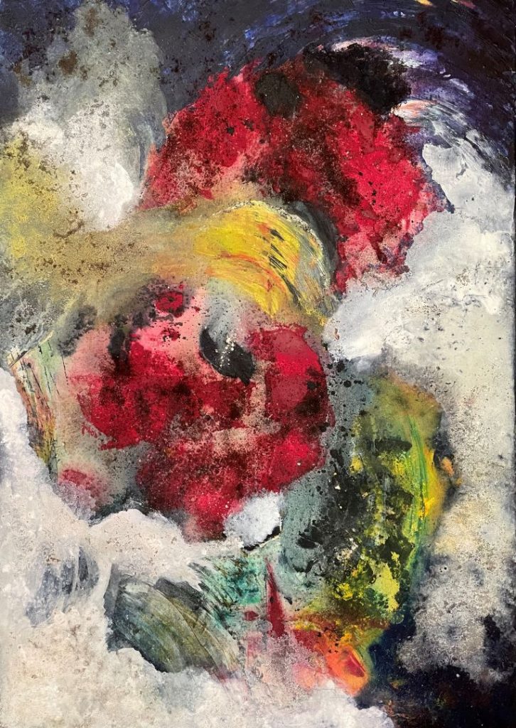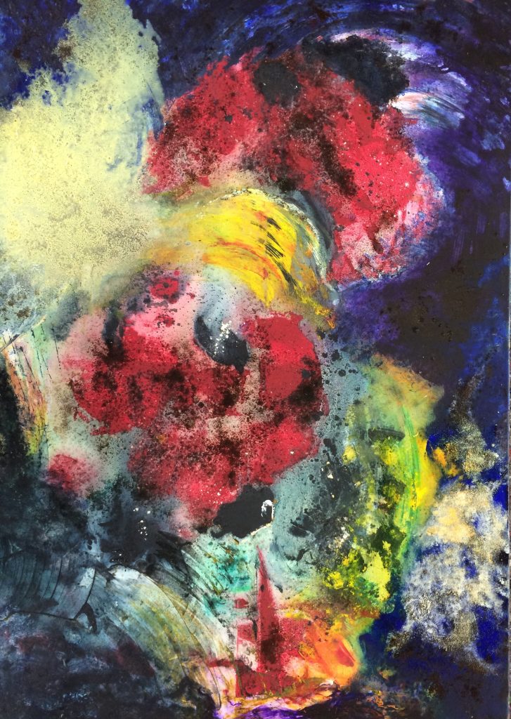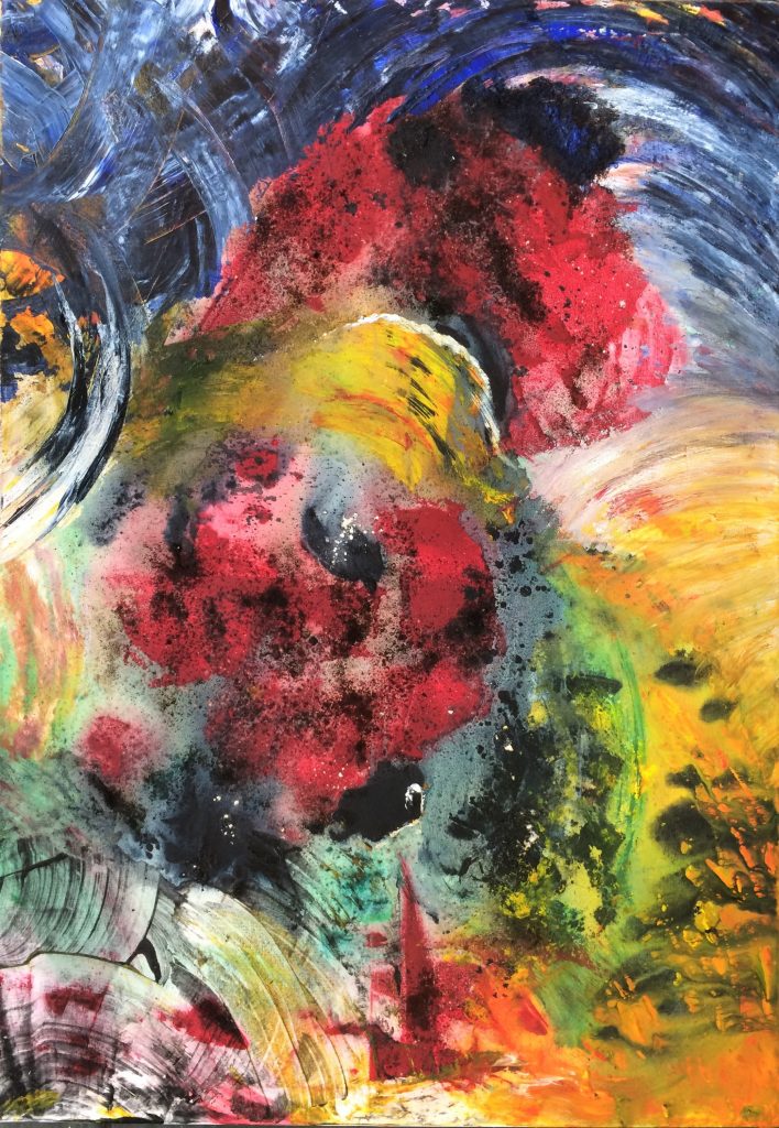 Eines meiner wenigen gegenstandslosen Bilder, in der Sommerakademie 2019 (expressive Malerei mit Carmelo Cicero) entstanden. Spontan und impulsiv malen, selten mit dem Pinsel, häufig mit dem Farbtopf auf die am Boden liegende Leinwand, dann den Verlauf mit leichten Bewegungen der Leinwand und reichlich Wasser steuern, den Zufall nutzen und weiter bearbeiten oder auch wieder zerstören.