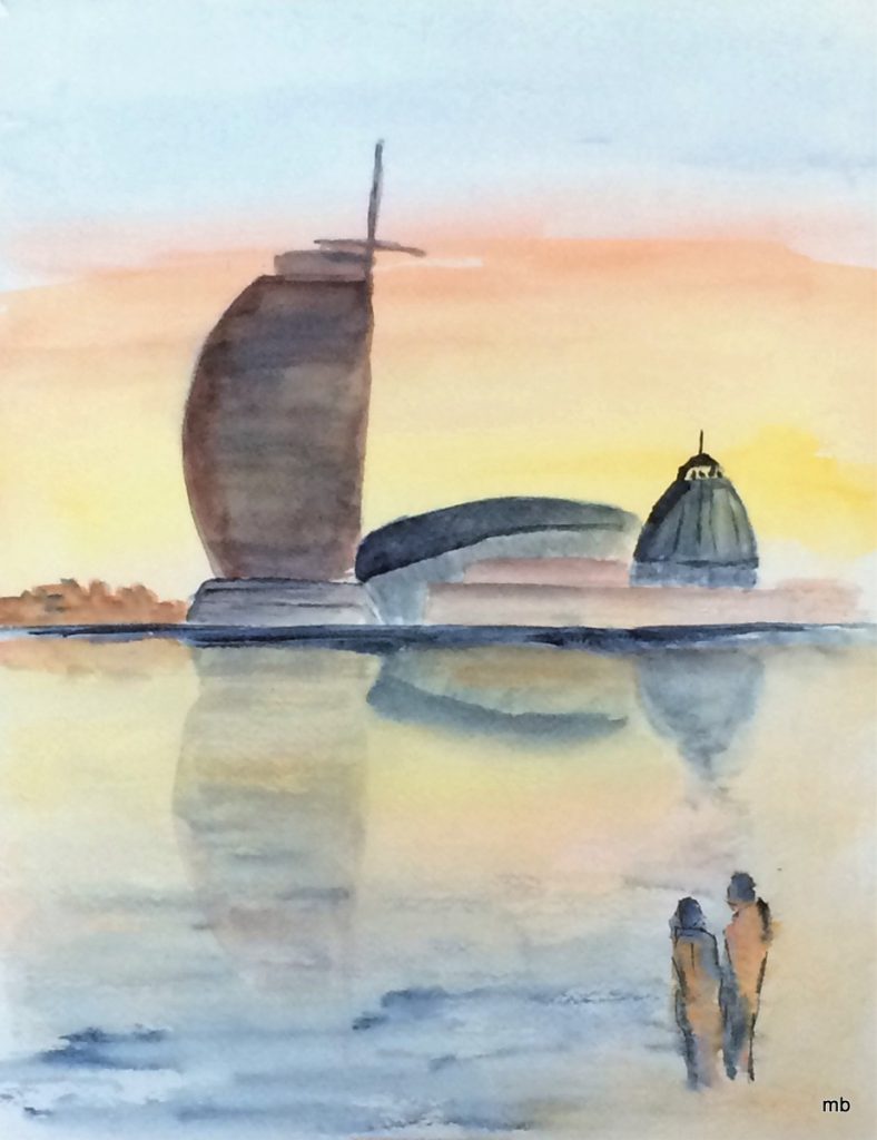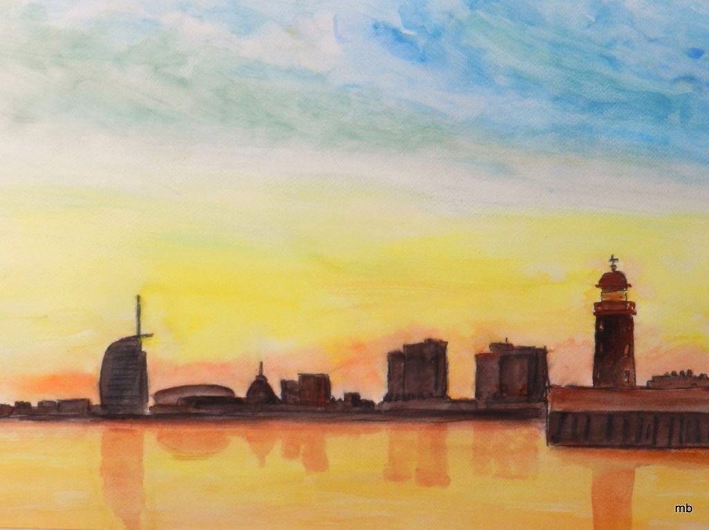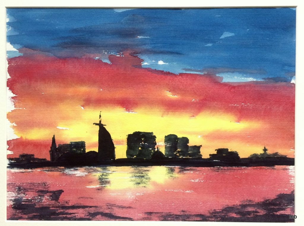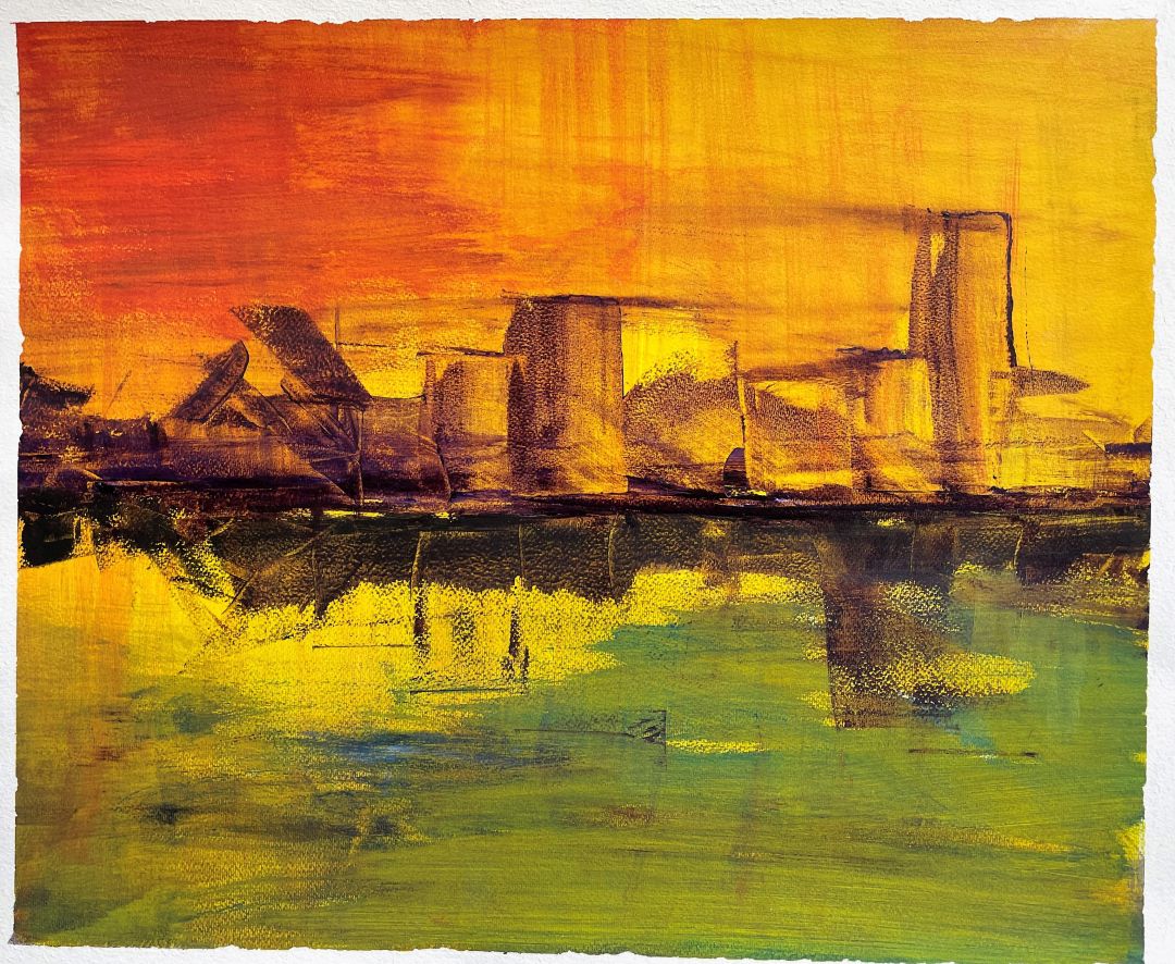 Mal eine andere Skyline, keine konkrete Ansicht – aber wahrscheinlich am Wasser gelegen. Die abstrakte Umsetzung lässt dem Betrachter den Spielraum „seine Skyline“ zu entdecken.